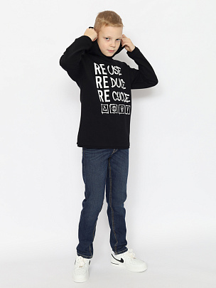 Толстовка с длинными рукавами, притачными планками по низу изделия и рукава. Капюшон с подкладкой и декоративным шнурком. Перед декорирован принтом "Перерабатывай и используй повторно".