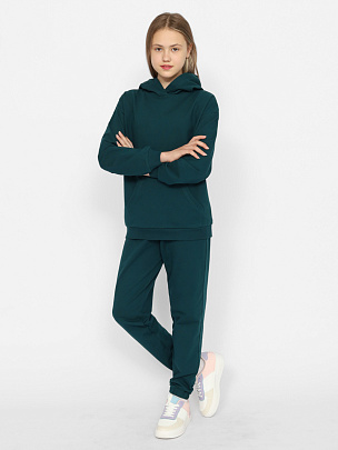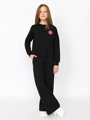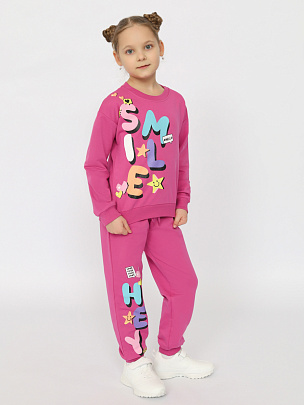 Джемпер для девочки с длинными рукавами. Горловина, рукава и низ изделия с эластичной резинкой. На полочке декоративный принт с блестящим эффектом и надписью - "Улыбнись". Брюки-джоггеры без карманов. Пояс притачной, со вставленной внутрь резинкой. В пояс вставлен шнур. Спереди деворативный принт с блестящим эффектом и надписью - "Привет". Внизу манжеты.