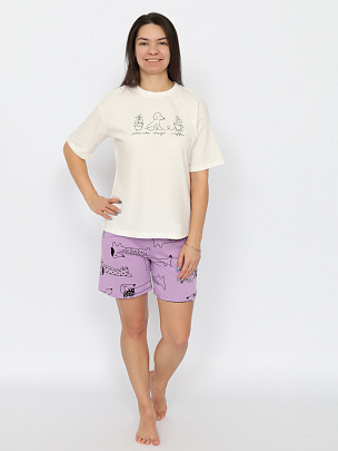Пижама комбинированная из футболки и шорт. Футболка оверсайз с коротким рукавом выполнена из гладкокрашеного полотна. Горловина обработана притачной бейкой из рибаны с лайкрой. Перед оформлен принтом. Шорты свободного покроя длиной до середины бедра выполнены из набивного полотна дополнительного цвета. Цельнокроенный пояс обработан плоским швом вподгибку с одновременным прокладыванием резинки.