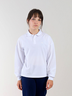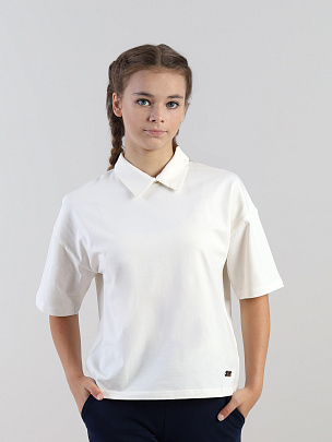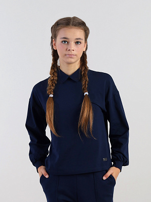 Джемпер свободного силуэта для девочки со спущенным плечом и длинными рукавами. Полочка декорирована принтом с блестящим эффектом. Воротник из основного полотна.
