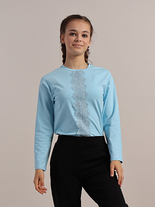 Джемпер свободного силуэта для девочки со спущенным плечом и длинными рукавами. Полочка декорирована принтом с блестящим эффектом. Воротник из основного полотна.