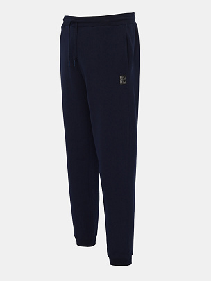 Брюки на манжетах внизу. Отрезной пояс выполнен из основного полотна. В поясе функциональный кругловязаный шнур вставлен в петли. Карманы наклонные в боковых швах. Декорированы жаккардовой этикеткой.