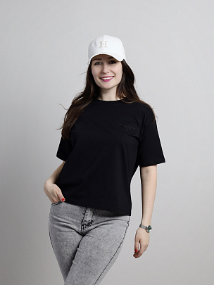 Футболка женская, из тонкого хлопкового трикотажа, украшена принтом.