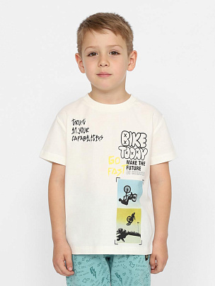Футболка с коротким рукавом. Горловина круглая, обработана узким воротником из полотна с эластаном. Перед оформлен небольшим принтом.